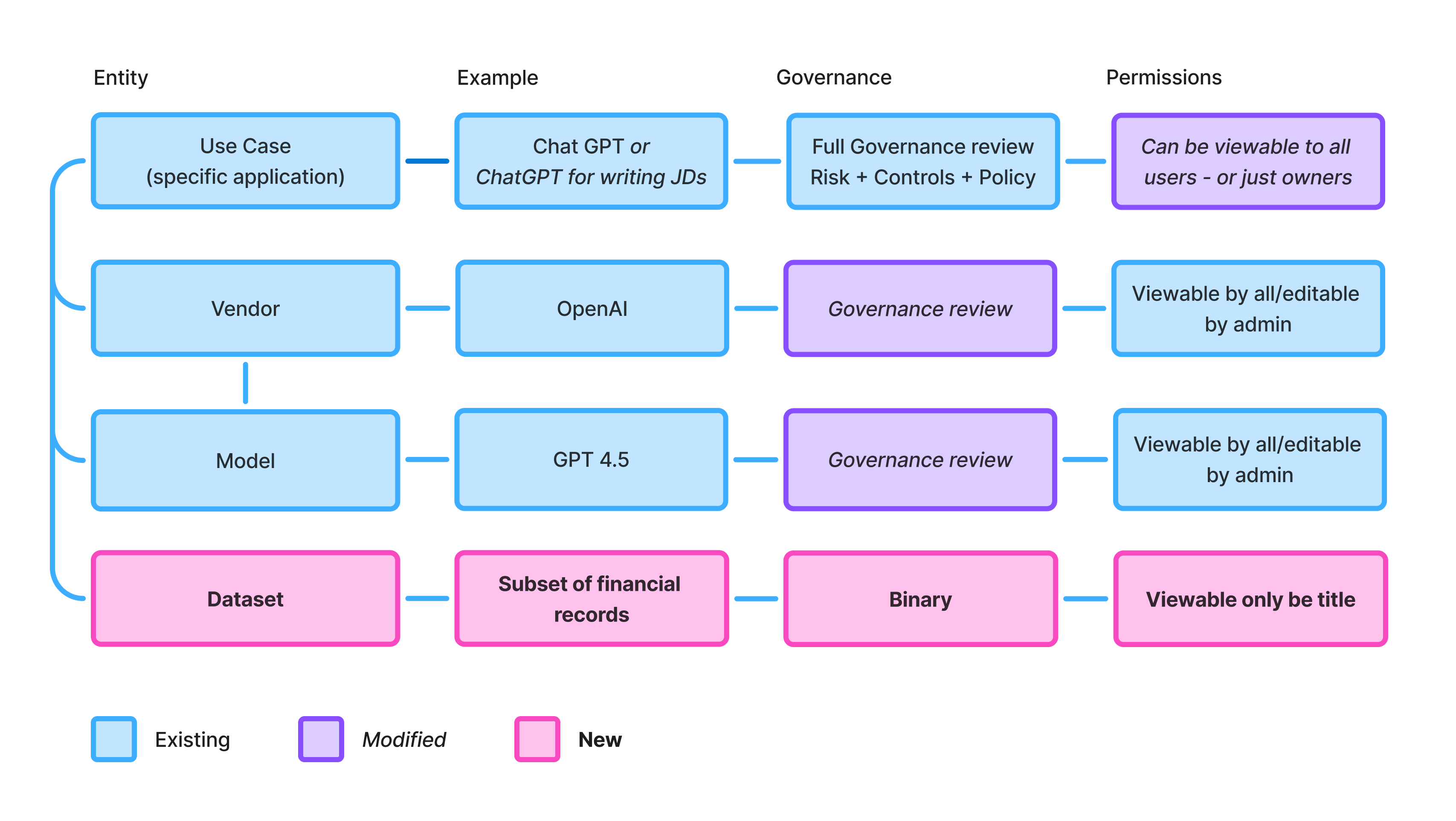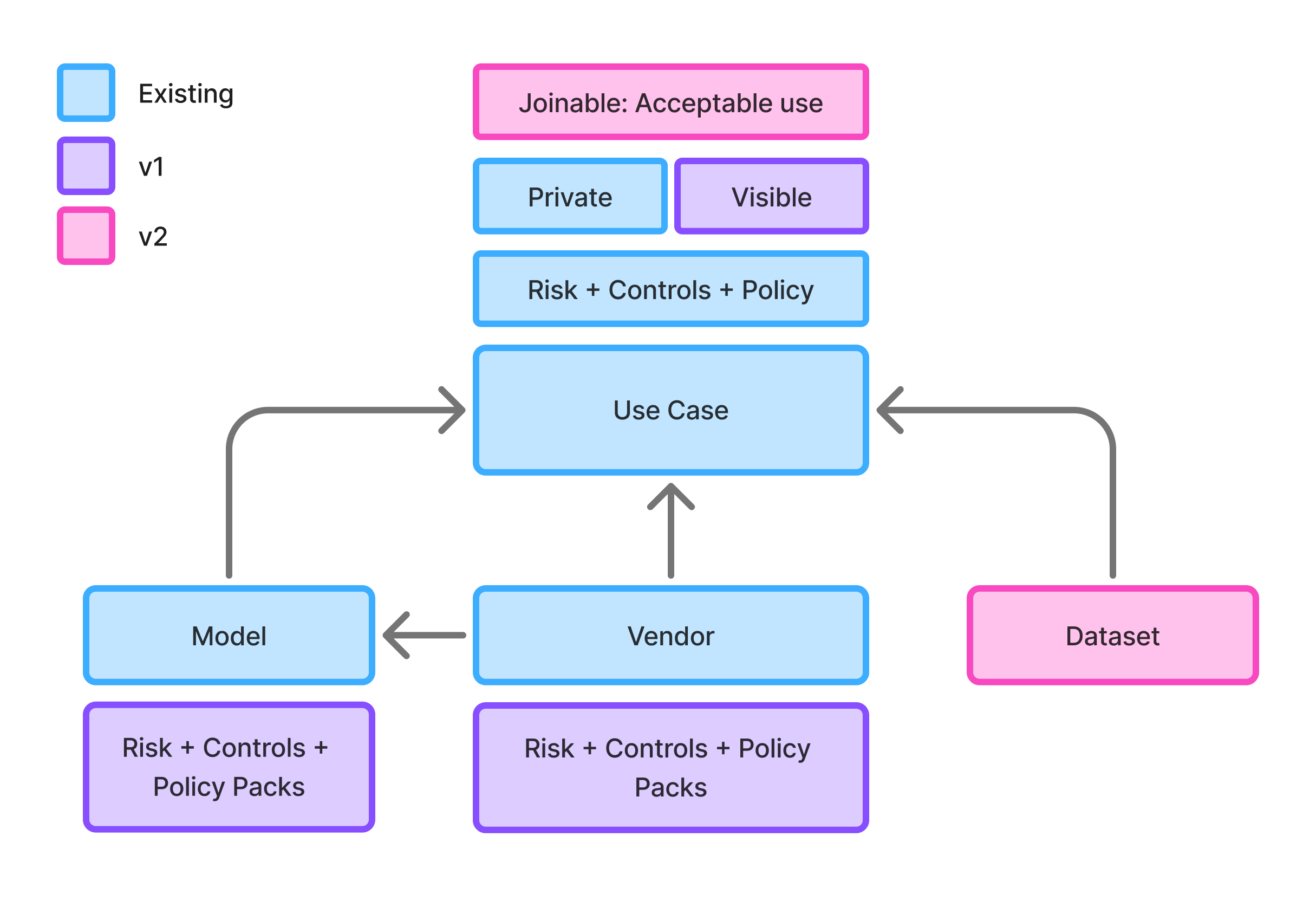 We explored governing at the model or vendor level instead, with a parent "Systems" entity connecting models, vendors, and use cases under one umbrella. Architecturally appealing, but AI usage was shifting every six months—rigid hierarchy on unstable adoption didn't pass the smell test. Design partners confirmed the opposite problem: a single model could power a low-risk summarizer and a customer-facing decision system.