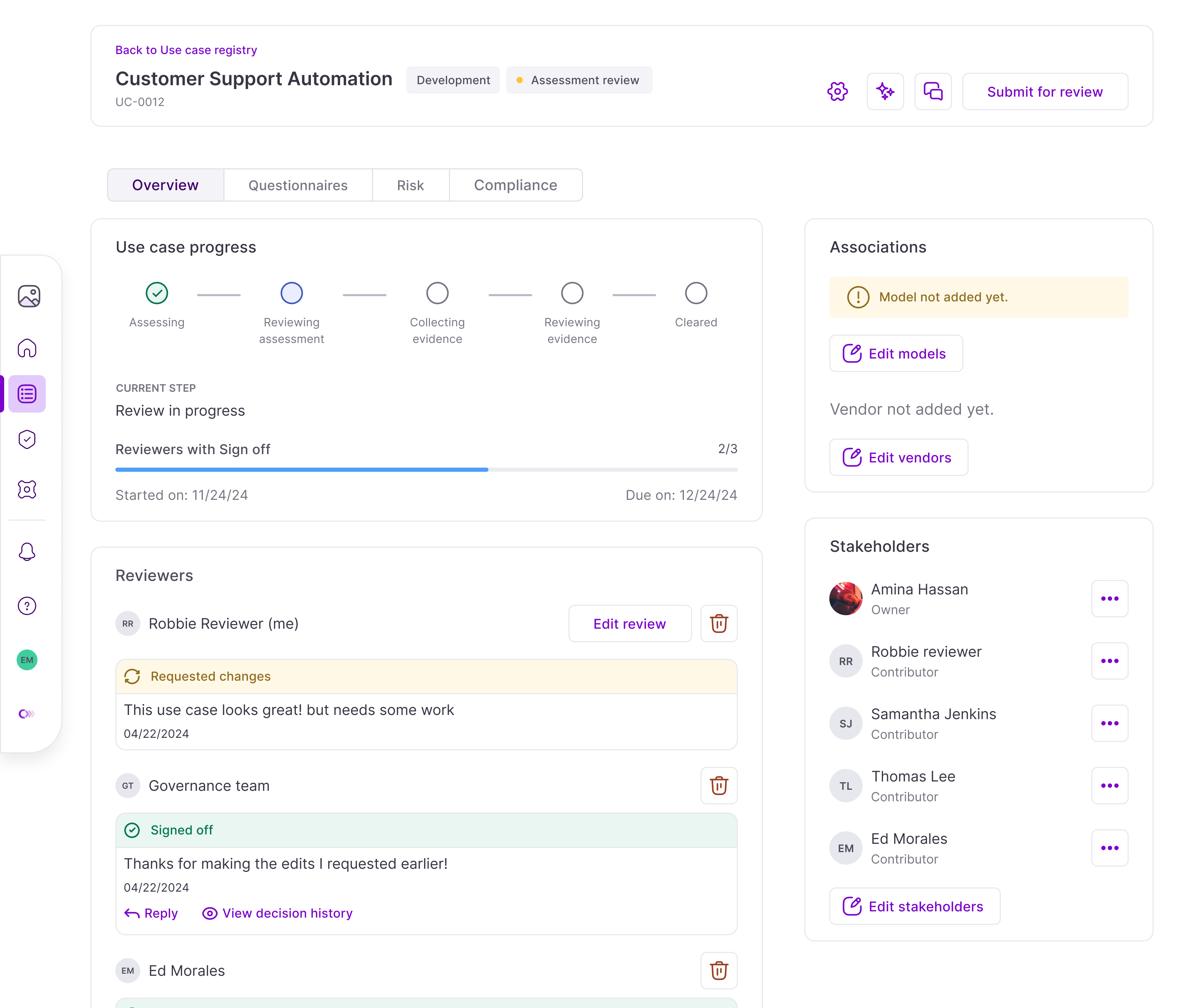 Instead of registering a use case, a user can now find an existing use case, accept its terms, and add themselves. This collapsed the most common source of duplication: teams independently registering usage already governed elsewhere.