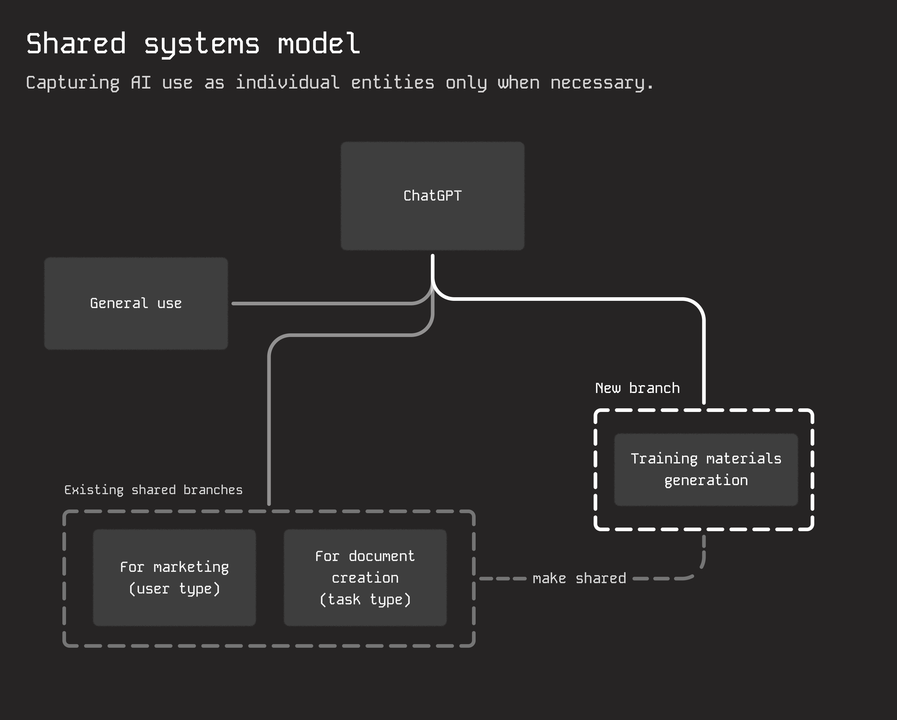 Acceptable use converged broad, low-risk AI usage into a single governed system, collapsing duplication and establishing a baseline for oversight. The system can branch: shared systems extend into usage-specific sub-entities with their own policies and constraints. This preserves centralized governance for common patterns while allowing specialized usage to evolve independently—introducing private use cases only when necessary.
