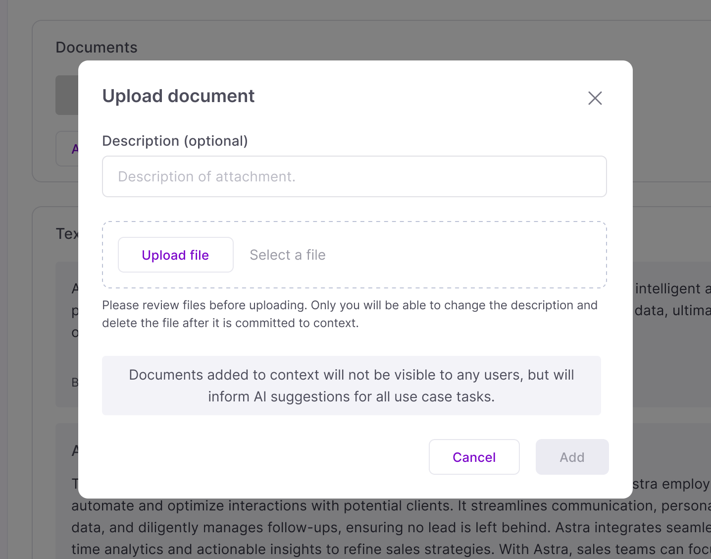 Each use case stores all uploaded context in a single shared database, and AI Assist draws from the full pool when generating suggestions, no filtering by contributor.